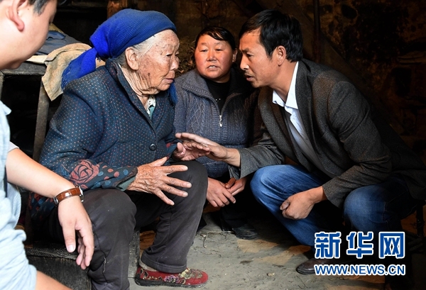 云南省曲靖市馬龍縣王家莊街道莊郎社區(qū)黨支部書記張炳才(右一)在了解81歲的許留英老人的生活狀況,為其制定精準(zhǔn)脫貧方案(2016年6月3日攝)。新華社記者藺以光攝
