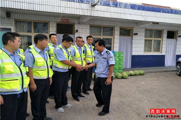 西部決策網(wǎng)訊( 鄒坤 通訊員 崔春月) 時(shí)值夏日,天氣持續(xù)高溫,2016年8月10日下午,靖邊縣公安局黨委委員、交警大隊(duì)長(zhǎng)王世崗、辦公室主任黃瑞峰等一行來(lái)到該大隊(duì)城區(qū)二中隊(duì)慰問(wèn)在高溫酷熱天氣下堅(jiān)守崗位的一線民警,深刻表達(dá)了大隊(duì)黨委對(duì)一線民警的關(guān)心和關(guān)愛(ài),并將防暑降溫物品及時(shí)送到了一線民警手中。