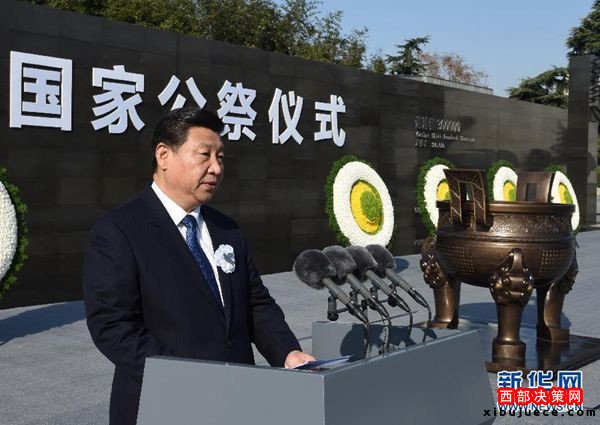 2014年12月13日上午,中共中央、全國(guó)人大常委會(huì)、國(guó)務(wù)院、全國(guó)政協(xié)、中央軍委在南京隆重舉行南京大屠殺死難者國(guó)家公祭儀式。中共中央總書(shū)記、國(guó)家主席、中央軍委主席習(xí)近平出席并發(fā)表重要講話。