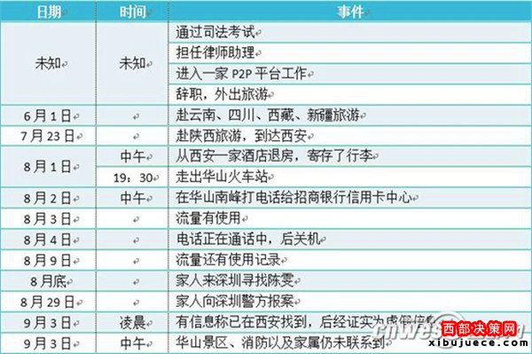 據(jù)陳雯表姐蔡女士介紹,陳雯于2016年6月1日起,自深圳前往云南、西藏、新疆等地游玩,7月22日自烏魯木齊飛往咸陽,隨后與家人失去聯(lián)絡,且微信好友均被拉黑,自8月2日起,手機便處于關機狀態(tài)。