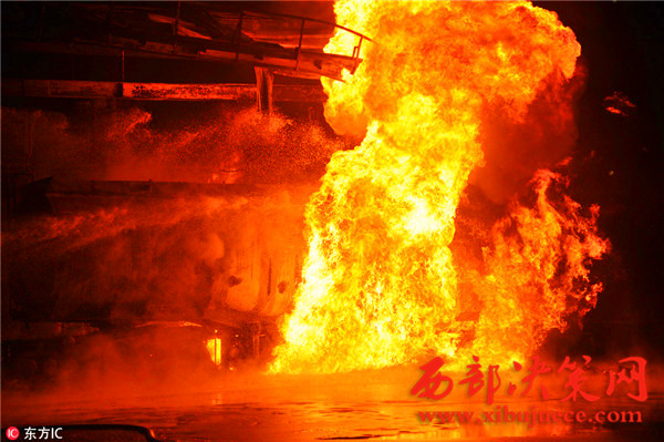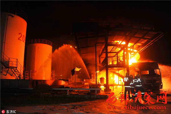 據(jù)了解,事故發(fā)生油罐區(qū)占地約40畝,主要生產(chǎn)航空汽油,油罐區(qū)共有油罐10個,油罐內(nèi)裝有原料及航空汽油約300余噸,發(fā)油平臺往罐車內(nèi)輸送航空汽油時突然發(fā)生火災,燒毀發(fā)油平臺及油罐車等,著火油罐車儲量30噸,著火時車內(nèi)汽油約10噸,過濾器中有油約7噸,共計約17噸燃油,離鄰近儲油罐約30米。
