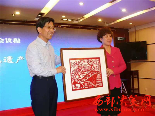 平?jīng)鍪姓笔虚L(zhǎng)李生發(fā)向參會(huì)各?。▍^(qū))代表贈(zèng)送平?jīng)黾艏埶囆g(shù)作品