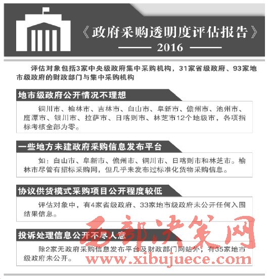《報告》披露:我國政府采購信息公開情況仍不理想。主要表現(xiàn)為:地市級政府公開情況不佳。其中,陜西省銅川市、榆林市、吉林省吉林市、白山市、遼寧省阜新市、海南省儋州市、安徽省池州市、江西鷹潭市、寧夏銀川市以及西藏拉薩市、日喀則市和林芝市等12個地級市,在政府采購信息透明度各項指標考核中全部為零分,在93家地市級政府成績排比中墊底。