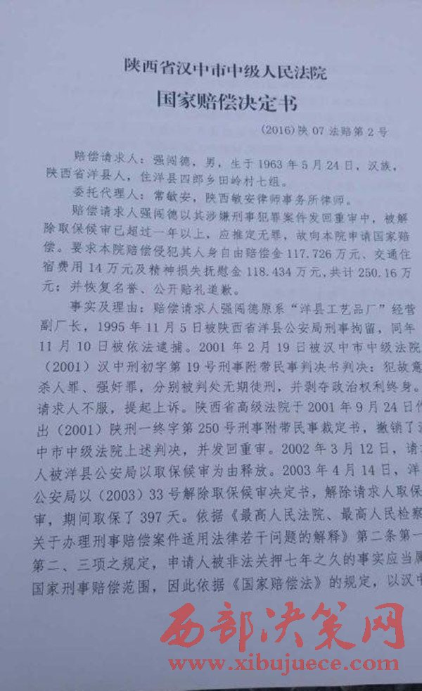 2016年11月9日,陜西省漢中市中級人民法院作出國家賠償決定,國家賠償書上說,根據(jù)《中華人民共和國國家賠償法》的有關(guān)規(guī)定,決定賠償強(qiáng)闖德561893.70元。(強(qiáng)闖德共被羈押2319天,每天按242.30元賠償)。而對于強(qiáng)闖德提出的交通、住宿等費(fèi)用,以及精神賠償?shù)纫?,不予支持?/span>