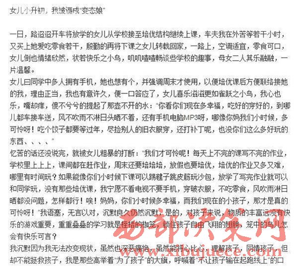 家長如此不辭辛勞,背后卻也有著道不盡的苦水。武漢一位媽媽就發(fā)出了名為《女兒小升初,我被逼成"變態(tài)娘"》的帖子,講訴自己節(jié)衣縮食,卻給孩子花很多錢報(bào)各種培訓(xùn)班,控訴"變態(tài)的培優(yōu)市場"和不公平的升學(xué)門檻,引來許多家長共鳴。