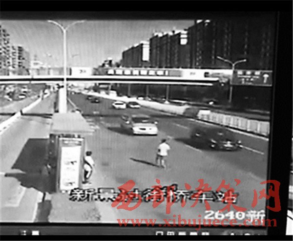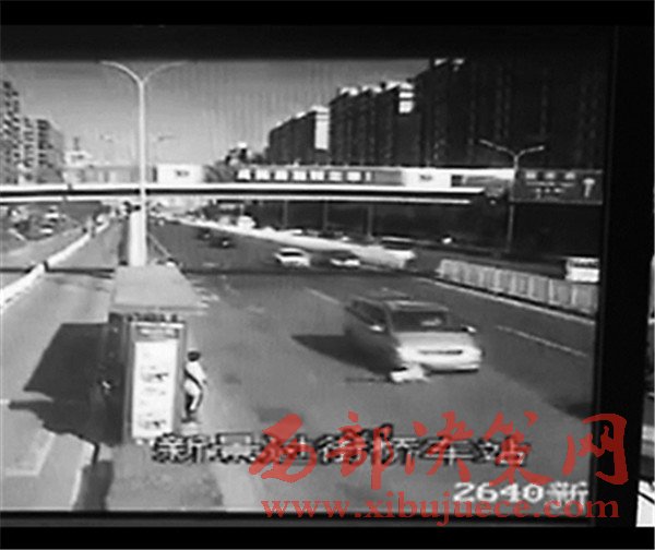 這段不到5秒鐘的視頻翻拍自事發(fā)現(xiàn)場的一個(gè)監(jiān)控?cái)z像頭,視頻正對的方向是一個(gè)公交站臺和機(jī)動車道。