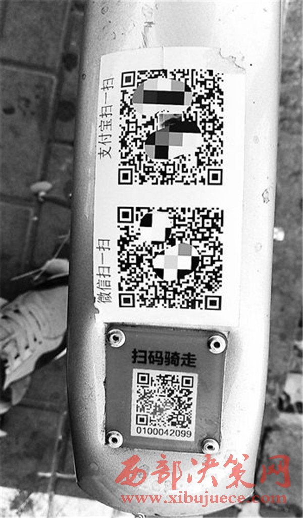 紀(jì)先生告訴北青報記者,11月14日下午5點多,自己經(jīng)過海淀區(qū)的海淀大劇院對面,看到路邊停放著摩拜單車,打算解鎖一輛騎著走。“走近一看,發(fā)現(xiàn)在單車的‘掃碼騎走’上方,還貼著一個微信二維碼和一個支付寶二維碼”。