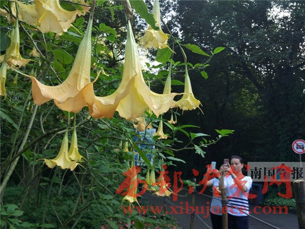 “南瓜花不是長在藤蔓上的嗎,怎么這些‘南瓜花’都倒吊著長在了樹枝上?”昨日,柳州市龍?zhí)豆珗@里的不少游客,都被路旁一種奇異的開花樹木所吸引,紛紛駐足觀賞拍照。記者了解到,那是公園新近引種的木本曼陀羅,因?yàn)閷儆谟卸局参?,市民前往觀賞時(shí),最好眼看手勿動(dòng)。