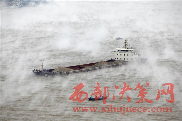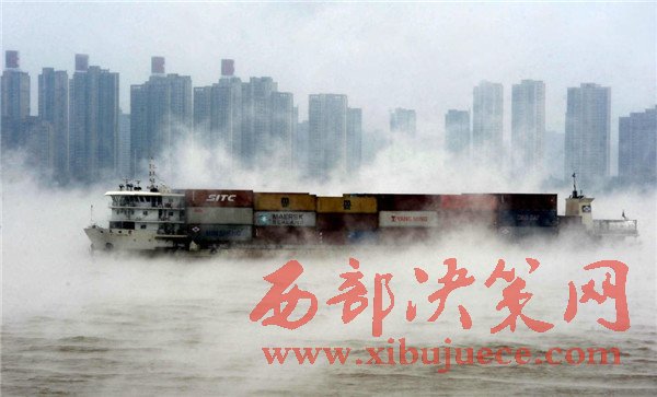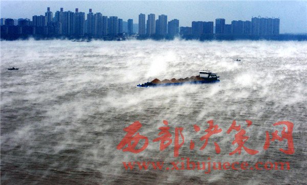2016年11月23日,湖北武漢,寒潮帶來極速降溫后,由于江水溫度較大氣溫度高出不少,長江江面上出現(xiàn)層層水霧,煙波浩渺,蔚為壯觀,放眼望去,仿佛整個城市都漂浮在云霧之中。