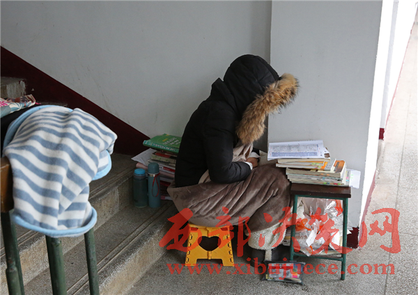 為了不影響自習(xí)室同學(xué)復(fù)習(xí),當(dāng)天安慶師范大學(xué)許多考研學(xué)子來到樓道上,身裹毛毯背誦考點(diǎn)。