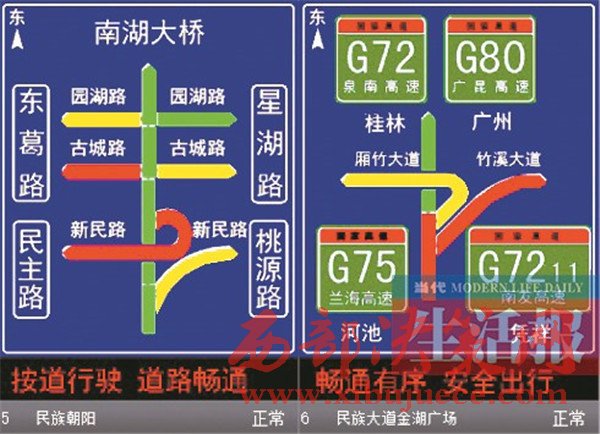 今后,駕車駛入南寧市區(qū)的司機們只要抬頭看交通誘導屏,就能看到高德地圖提供的實時路況信息,了解附近道路的擁堵狀況,并根據(jù)屏幕上各線路的顏色選擇最優(yōu)路線,做到智慧出行。