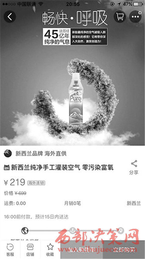 “想呼吸到最純凈、最新鮮的空氣嗎?那就來瓶威海最純凈新鮮的空氣吧!無霧霾,絕對純凈!可海邊,可山區(qū),不加價(jià)!”在某電商平臺上,一家名為“威海自駕游俱樂部”的網(wǎng)店,掛出了名為“威海天然新鮮空氣”的商品,并打出了如上的廣告語。