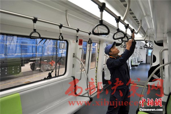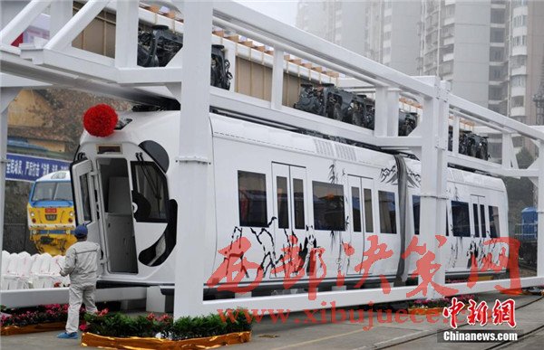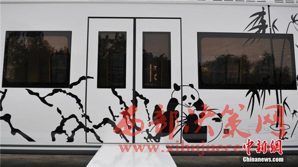 記者在現場看到,正式下線的空鐵車身為卡通熊貓山水圖案,酷似“熊貓”,每列定員144人,時速最高可達65公里。列車采用“大容量動力蓄電池充放電控制技術”,通過實現高倍率放電,提高列車起動加速性能及對極限環(huán)境的適應性,同時能將400千瓦的電制動功率全部用于動力電池快速充電,實現制動能量回收再利用,延長蓄電池續(xù)航里程達120千米。圖為車身外繪制有熊貓山水圖案。