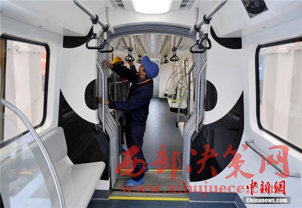 此外,列車整體結構也采用輕量化設計,全線無人駕駛,能像地鐵、動車組一樣靈活編組。列車在懸掛裝置設有兩級保護,還在駕駛室內設有緊急逃生筒和故障救援門,可實現縱向、橫向及垂向的三維救援,確保了突發(fā)情況下乘客的安全。圖為車廂內也繪有“熊貓”圖案。