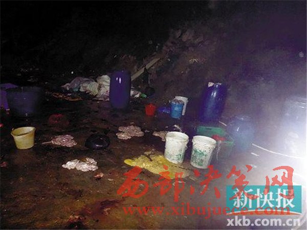 在查獲現(xiàn)場,違法人員臨時(shí)搭建的私宰帳篷里,地上鋪滿了豬血和豬毛的混合物,生豬糞便隨著水流漸漸形成一條“小河”流向遠(yuǎn)處,殺豬刀、鐵鉤、鐵叉等用于私宰的工具隨意擺放在地上,與豬毛、豬血、糞便等混合在一起?,F(xiàn)場一口直徑近2米的大鍋盛滿了水,熱氣騰騰。