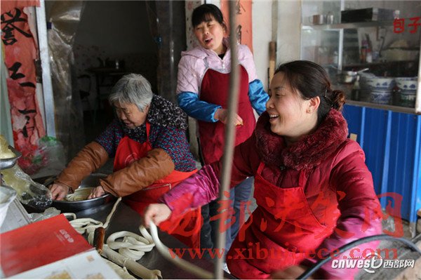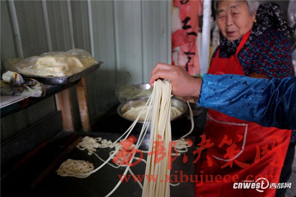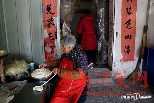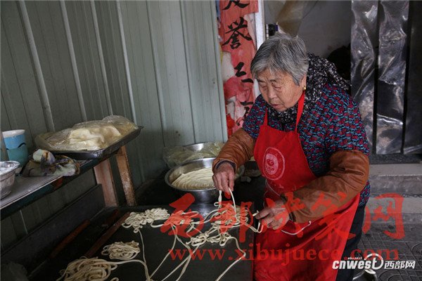 西安南二環(huán)附近的一條小巷里,新安醫(yī)院門口,70歲的賀玉蘭老人和兒媳劉艷寧在她們的實(shí)惠面館里忙碌著,揉面、拉條子、下面、給食客端面,婆媳倆默契得就像一個(gè)人,“二人成一心,黃土變成金。” 賀玉蘭老人喜歡老家蒲城的這句老話。
