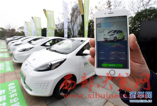 12月22日,在南京市江寧會展中心租還車網(wǎng)點(diǎn)的展示體驗區(qū),工作人員展示分時租賃電動汽車的手機(jī)預(yù)約平臺。