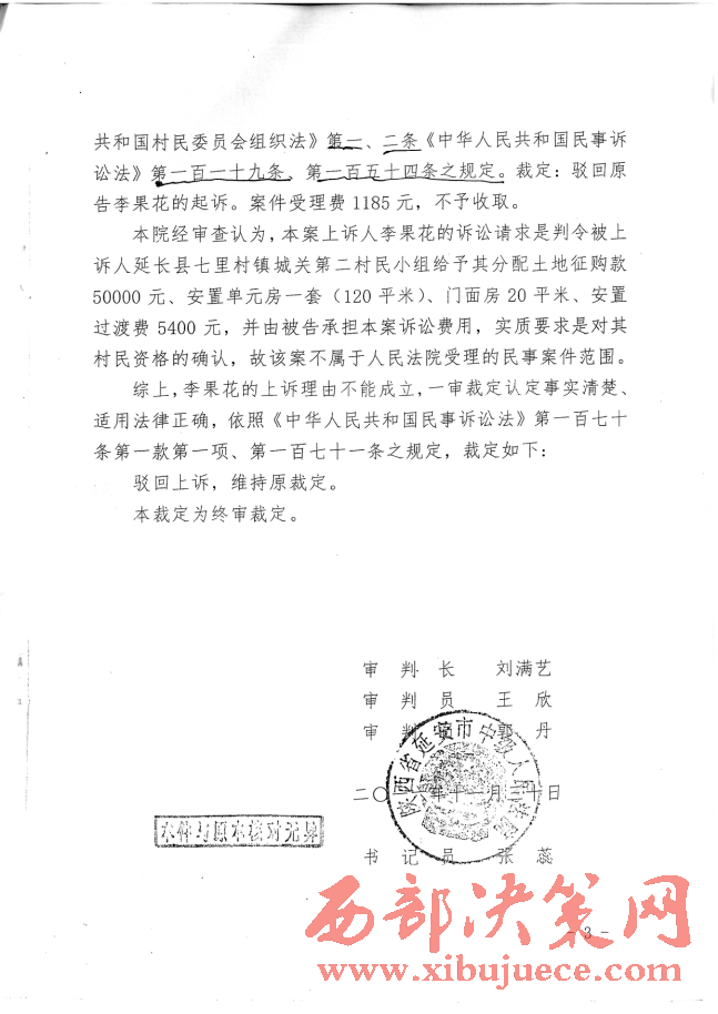 記者又多次翻閱了延長縣人民法院(2016)陜0621號民初541號民事裁定書和延安市中級法院(2016)陜06民終1658號民事裁定書,兩級法院都用同樣的理由是:“李果花的訴訟請求是判令被上訴人延長縣七里村鎮(zhèn)城關(guān)二村民小組給予其分配土地征購款50000元,安置單元房一套(120平米),門面房20平米,安置過渡費(fèi)5400元,并由被告承擔(dān)案件訴訟費(fèi)用,實(shí)質(zhì)要求是對其村民資格的確認(rèn),故該案不屬于人民法院受理的民事案件范圍。”一審法院駁回起訴,二審法院是駁回上訴,維持原判。正如反映人李果花稱:“我訴訟的是要回我合法的土地征購款、安置房、門面房、安置過渡費(fèi)。村民的資格確認(rèn),我有的合法的戶口簿、身份證,又有鎮(zhèn)政府領(lǐng)導(dǎo)、村干部、村民代表的協(xié)議書還不夠嗎?”