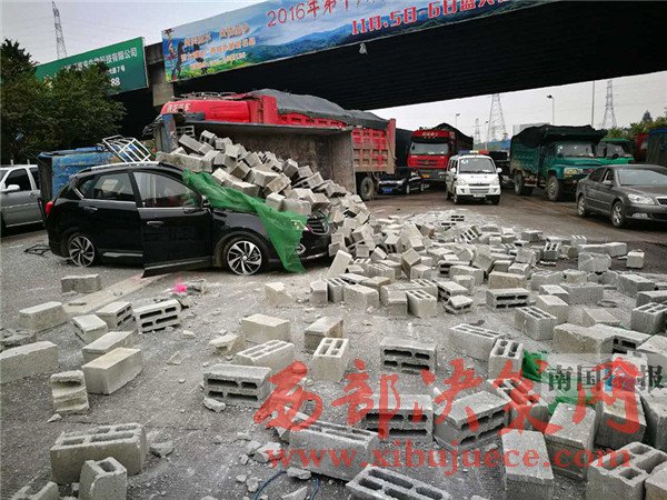 柳北大隊事故處理民警趕到現(xiàn)場看到,運磚的大貨車側(cè)翻在地,一車的方磚撒了一地,而一輛黑色寶駿車靠在大貨車車頭處,車身和引擎蓋上堆滿了磚頭。寶駿車受損嚴(yán)重,前后擋風(fēng)玻璃被磚頭砸壞,車頂有一定程度的塌陷,車子右側(cè)兩個輪胎被壓扁,車內(nèi)的安全氣囊也爆了出來。