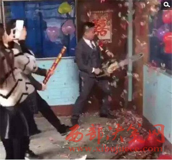 伴娘擋在門(mén)前,向新郎要紅包,一定要數(shù)目夠大才肯開(kāi)門(mén)。現(xiàn)場(chǎng)的伴郎團(tuán)把伴娘拉下去,新郎撿起了地上的一把電鋸,這是要干什么呢?