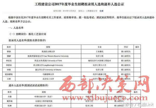 原標題:中石化2017畢業(yè)生招聘擬錄用人員正式公示!
