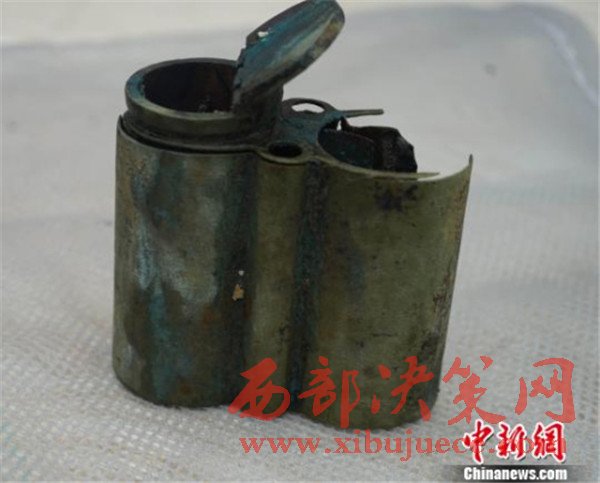 圖為“呂義泰白銅壽紋水煙袋”,缺水斗、吸管。外筒上下口沿云雷紋,中腹團壽紋。煙倉內(nèi)蓋上刻有“漢鎮(zhèn)呂義泰劉盛”字樣。寬8.8,殘高8.8 ,單筒徑4.1厘米。“丹東一號”水下考古隊供圖