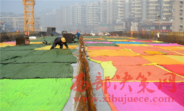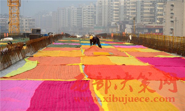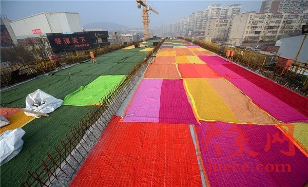 2017年1月2日,濟南,在七里山路附近的順河高架橋南延施工現(xiàn)場,百余米長的高架橋路面鋪設(shè)了彩色的棉被,總數(shù)達到100多條,覆蓋面積約2000多平方米 。據(jù)了解,該段高架橋為新澆筑的箱梁,為確保冬季低溫下混凝土能夠保證強度和防凍,施工采取多種保暖法,為路面蓋棉被取暖。