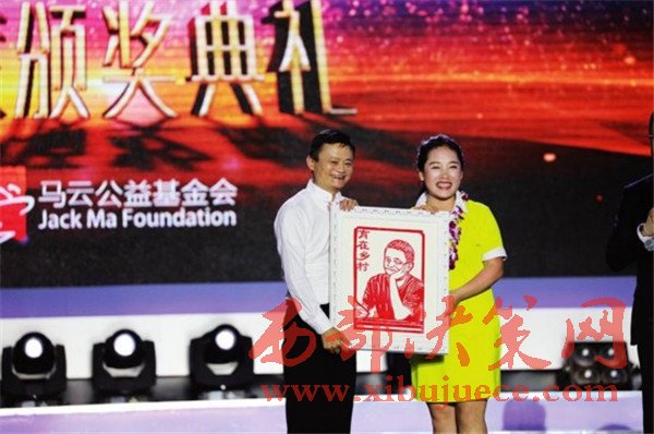 陜西獲獎教師代表馮海燕送剪紙肖像給馬云