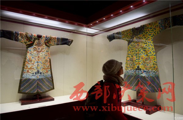2017年01月05日,遼寧省沈陽市,沈陽故宮博物院舉行“錦繡華彩—院藏清宮織繡展”,清朝皇帝冬季朝袍首次亮相。沈陽故宮是中國僅存的兩大古代皇家宮殿建筑群之一,為清朝初期努爾哈赤和皇太極的宮殿,距今近400年歷史,貯藏近20萬件清宮御用物品和內府秘籍。清明黃江綢繡金龍出鋒夾朝袍。