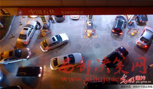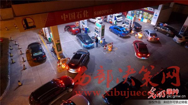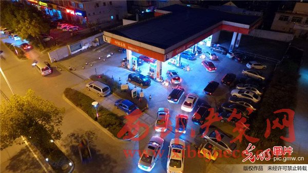 2017年1月12日晚,航拍揚州一家加油站,車主排隊等待加油。