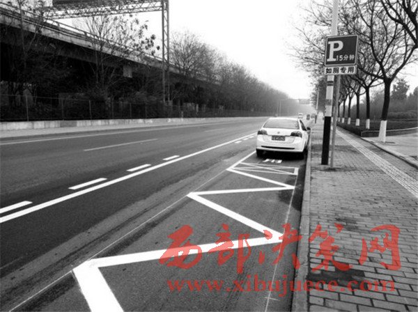 記者現(xiàn)場看到,如廁停車位大多緊鄰公廁,設(shè)置在道沿下的路邊,白色的波折線,前方設(shè)置一個(gè)或兩個(gè)臨時(shí)停車位,停車位采用黃色起止標(biāo)線,標(biāo)線內(nèi)寫有“如廁專用”大字。緊鄰?fù)\囄坏穆愤叄O(shè)有牌,停車牌上寫著“15分鐘”的停車時(shí)限。