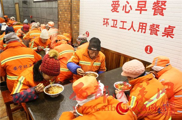 2017年1月15日,蘭州市委、市政府啟動的“愛心早餐”工程,蘭州市城市管理委員研究制定了《蘭州市一線環(huán)衛(wèi)工人“愛心早餐”工作實施方案》,以財政出資,企業(yè)讓利形式,按照每人每天5元的標準,實現(xiàn)蘭州市9014名環(huán)衛(wèi)工人憑“愛心早餐券”在全市242家牛肉面館就餐。