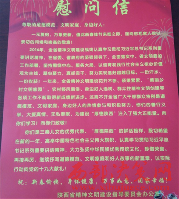 慰問(wèn)組每到一戶都詳細(xì)詢問(wèn)了模范們的家庭生產(chǎn)和生活狀況,囑咐他們保重身體,希望他們珍惜榮譽(yù),再接再厲,繼續(xù)發(fā)揮模范帶頭作用,在道德建設(shè)上再樹(shù)新形象,再展新風(fēng)采,再創(chuàng)新佳績(jī)。同時(shí)也號(hào)召全縣人民學(xué)好人、做好人,崇尚道德,弘揚(yáng)善舉率先垂范,樹(shù)立榜樣。