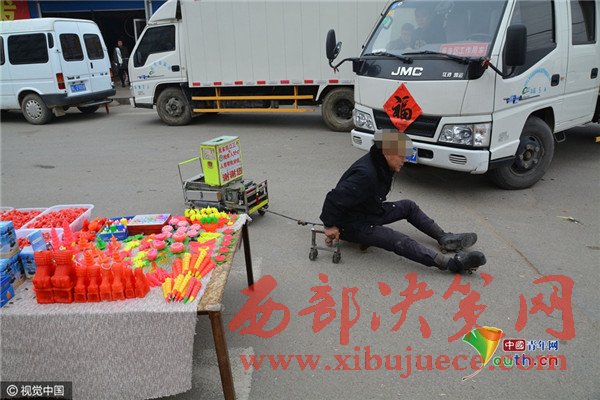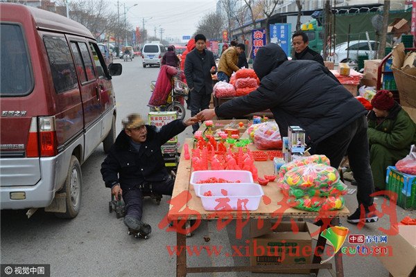 2017年2月6日,在山東省日照市莒縣南關(guān)大集上,今年58歲的葛平九,坐在他自己制作的小車上,用兩只手臂作支撐,拖著一雙殘腿,穿梭在車流和人流之間,向路邊賣蠟燭的攤位要求施舍。有愛心的攤主會給他一塊錢,有的會給他一根蠟燭。