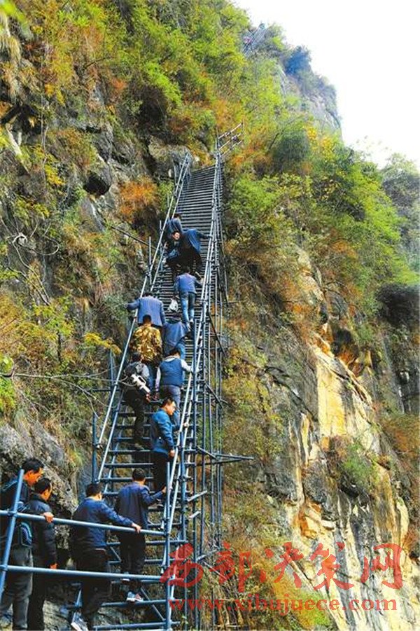 鋼梯,是從去年8月開始啟動修建的,州、縣兩級財(cái)政共投入了100萬元。11月,鋼梯完工投入使用。莫色子古說,這些鋼管牢牢焊入懸崖,一共組成21段、767級臺階。整個(gè)鋼梯用了大約1500根、40多噸鋼管,光是固定用的扣件,就用了6000多個(gè)。