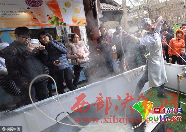 2月22日,田波如往常般工作,面館門口聚集了里外三層的圍觀者。正在拉面的田波,表演的正是網(wǎng)絡(luò)上廣為流傳的那個(gè)版本。妖嬈的動(dòng)作,嫵媚的表情,配上黃齡的那首《癢》,整個(gè)畫面活色生香。