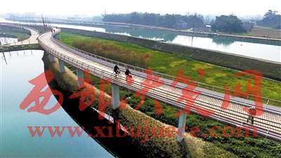 昨日上午,陽光明媚,記者來到剛剛建成的三道堰徐堰河濕地公園,河水清澈見底,河面上微風(fēng)吹拂,楊柳依依,白鷺飛翔,漣漪浪翻?,F(xiàn)場(chǎng),一座飛架于河面兩側(cè)的“空中綠道”格外引人注目,三道堰鎮(zhèn)工作人員介紹,這座“空中綠道”南側(cè)全長(zhǎng)891米,北側(cè)全長(zhǎng)1300米,從空中俯瞰猶如雙龍飲水、長(zhǎng)虹臥波,取名為“雙虹橋”。該橋?qū)?.5米,可供兩人并肩騎行,這條風(fēng)景獨(dú)特的“空中綠道”才建成開放,就已經(jīng)吸引了四面八方的游客前來體驗(yàn)新鮮,跑步的、散步的、騎行的市民絡(luò)繹不絕。“我們昨天晚上到了這里,橋面沿線彩燈四射,像極了夜空中的彩虹,太美了。”來自天府安公騎游俱樂部的熊大爺說,他們?cè)?jì)劃是一早返回成都,但因?yàn)檫@里的景色太美,一早便騎行到這里希望見到白天的景色。熊大爺在橋上向下望去,一處處水鄉(xiāng)田園美景映入眼簾,人們的跑步聲、嘖嘖的贊美聲傳入耳畔……“這樣的景色使人格外地陶醉!”