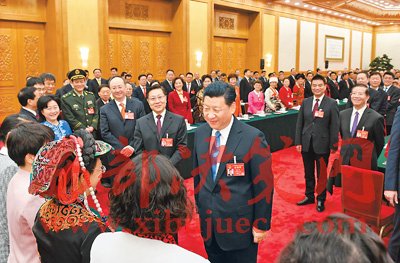 3月8日,中共中央總書記、國家主席、中央軍委主席習(xí)近平參加十二屆全國人大五次會議四川代表團(tuán)的審議。在“三八”國際勞動婦女節(jié)到來之際,習(xí)近平代表黨中央、國務(wù)院,向參加全國兩會的女代表、女委員、女工作人員,向全國各族各界婦女同胞,致以節(jié)日的祝賀和誠摯的祝福。這是習(xí)近平同女代表親切交談。