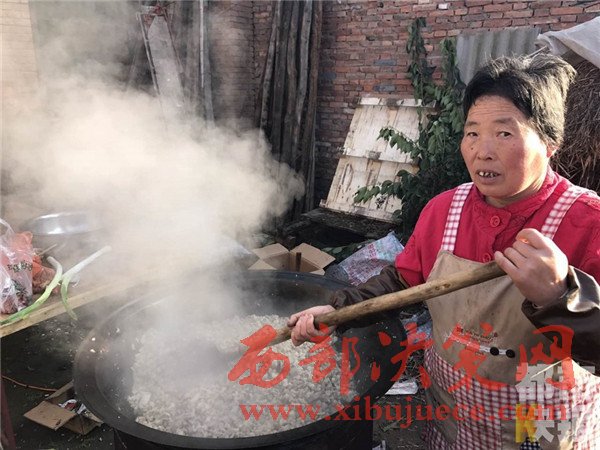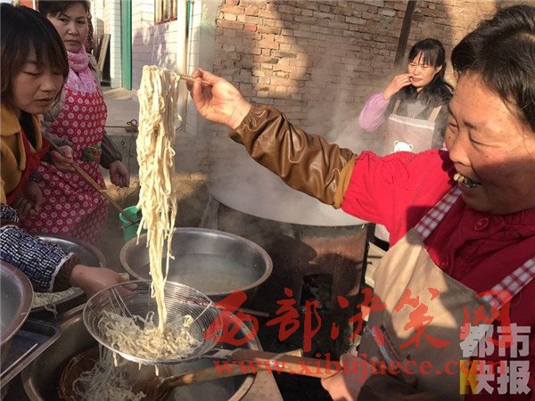 12月4日, 戶縣渭豐鎮(zhèn)元二村,村民們正在興高采烈的烹制著美味大餐,熱鬧非凡,頗有一種過大年的氣氛。熱氣騰騰的臊子面出鍋了,這第一碗面當(dāng)然要親手端給今天這場(chǎng)特殊宴會(huì)的主角——百歲老人段奶奶。