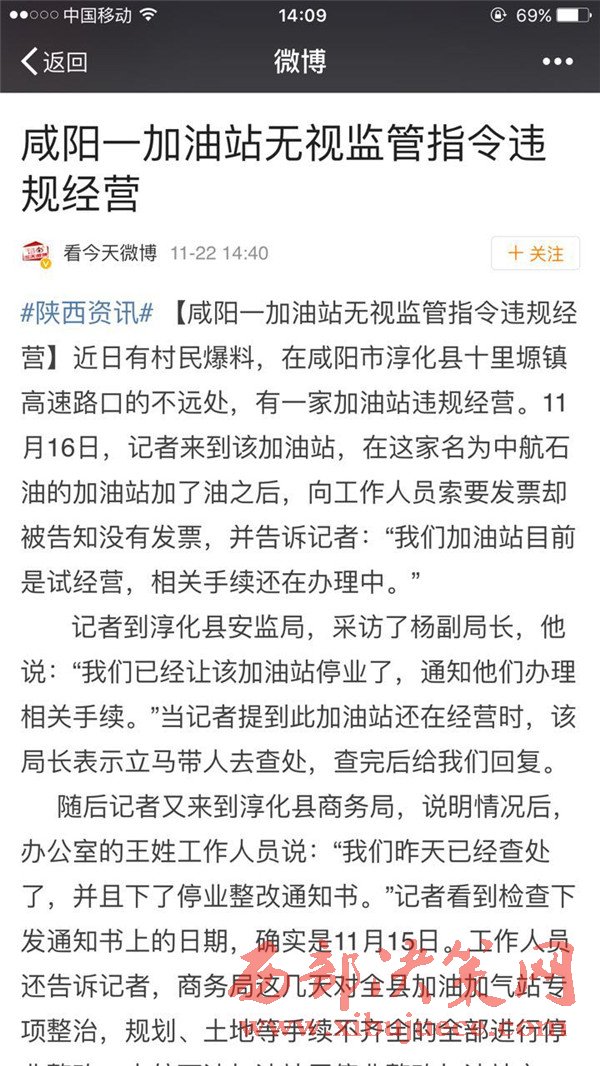 記者到淳化縣安監(jiān)局,采訪了楊副局長,他說:“我們已經讓該加油站停業(yè)了,通知他們辦理相關手續(xù)。”當記者提到此加油站還在經營時,該局長表示立馬帶人去查處,查完后給我們回復。隨后記者又來到淳化縣商務局,說明情況后,辦公室的王姓工作人員說:“我們昨天已經查處了,并且下了停業(yè)整改通知書。”記者看到檢查下發(fā)通知書上的日期,確實是11月15日。