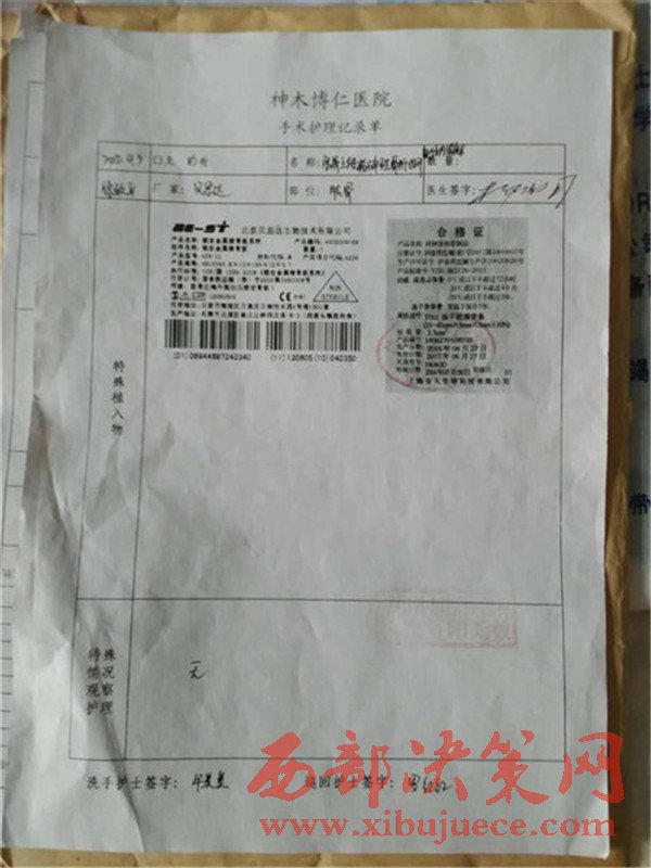 患者家屬將原來在博仁醫(yī)院住院的資料全部拿出來時(shí)發(fā)現(xiàn),大保當(dāng)博仁醫(yī)院當(dāng)時(shí)給患者做手術(shù)所用的鋼板可能存在問題,做手術(shù)所用的鋼板與當(dāng)時(shí)給患者提供的合格證書不符,在此期間家屬也找過原博仁醫(yī)院劉院長(zhǎng),所給的答復(fù)是他剛來不知道此事,董事長(zhǎng)(賀玉剛)也說是在西安,你們先看病,回頭把鋼板拿過來,等鋼板廠家的人來了,我們?nèi)阶谝黄鹂丛趺唇鉀Q,就這樣一直拖著直到現(xiàn)在。