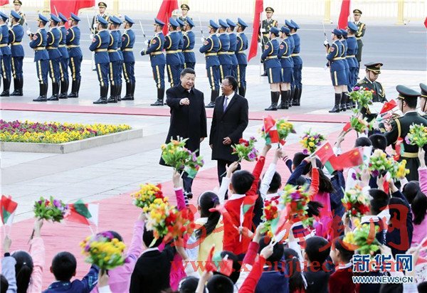 會談前,習(xí)近平在人民大會堂東門外廣場為埃里舉行歡迎儀式。習(xí)近平主席夫人彭麗媛、全國人大常委會副委員長嚴雋琪、國務(wù)委員楊潔篪、全國政協(xié)副主席李海峰等出席。