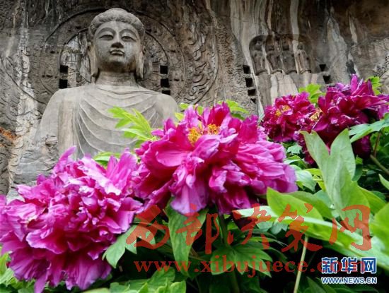 目前正值洛陽牡丹的盛花期,洛陽龍門石窟景區(qū)內(nèi)的近萬株牡丹爭奇斗艷,與古老的石刻佛像共同構(gòu)成獨(dú)特的風(fēng)景。