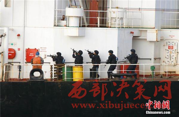 圖為特戰(zhàn)隊(duì)員快速登入商船展開(kāi)營(yíng)救活動(dòng)。