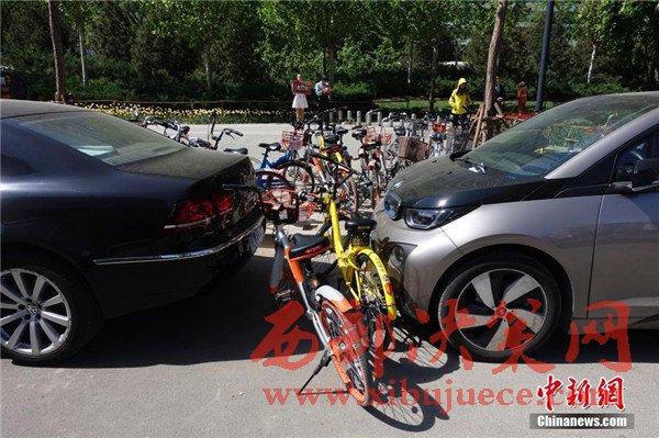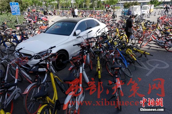 一輛私家車(chē)被各家公司、不同顏色的“共享單車(chē)”層層包圍。
