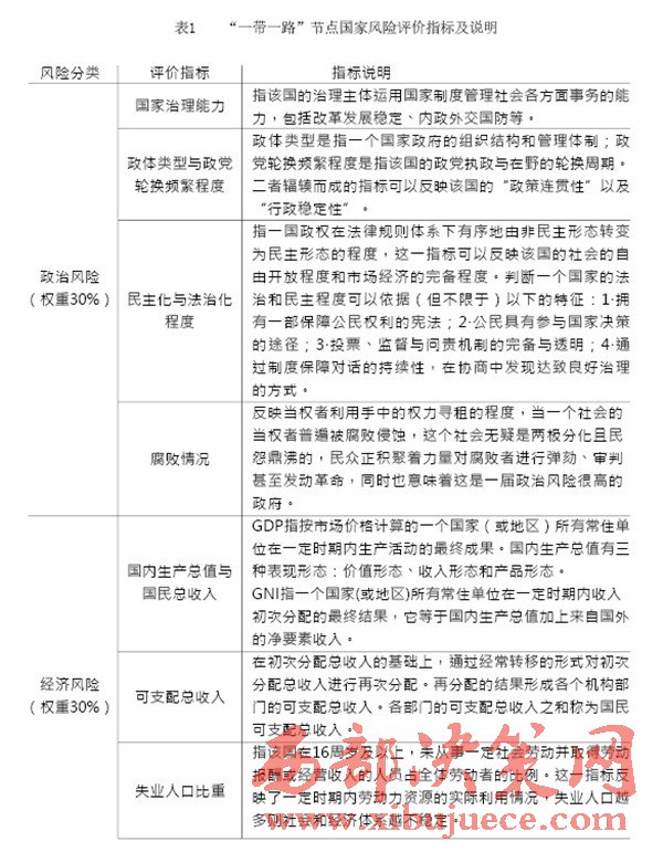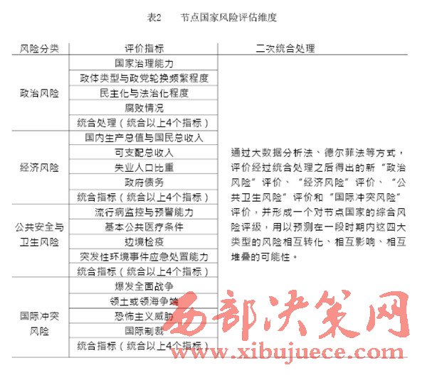 “一帶一路”建設(shè)中重要國家的治理風(fēng)險是我們的主要關(guān)注對象,在借助國內(nèi)外智庫和科研院所已完成的眾多研究成果的基礎(chǔ)上,建立一套對節(jié)點國家風(fēng)險的評級體系,如表1(見P28)所示。節(jié)點國家風(fēng)險評價指標中,政治風(fēng)險與經(jīng)濟風(fēng)險的評價參考經(jīng)濟學(xué)人智庫的國家風(fēng)險模型(EIU country risk model);公共衛(wèi)生風(fēng)險的評價參考中國衛(wèi)生與經(jīng)濟社會發(fā)展統(tǒng)計數(shù)據(jù)庫對公共衛(wèi)生的指標設(shè)計;國際沖突風(fēng)險評價根據(jù)經(jīng)濟學(xué)人智庫發(fā)布的白皮書《愿景與挑戰(zhàn)——“一帶一路”沿線國家風(fēng)險評估》與中國出口信用保險公司發(fā)布的2015年版《國家風(fēng)險分析報告》和《全球風(fēng)險地圖》綜合考量得出。具體而言,我們可以從“政治風(fēng)險”“經(jīng)濟風(fēng)險”“公共衛(wèi)生風(fēng)險”和“國際沖突風(fēng)險”四個維度來評估選擇出的節(jié)點國家的風(fēng)險,如表2(見P30)所示。