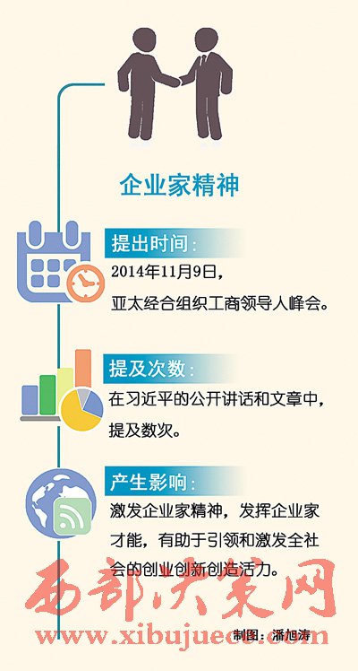 “我們?nèi)嫔罨母?,就要激發(fā)市場(chǎng)蘊(yùn)藏的活力。市場(chǎng)活力來(lái)自于人,特別是來(lái)自于企業(yè)家,來(lái)自于企業(yè)家精神。”2014年11月9日,在亞太經(jīng)合組織工商領(lǐng)導(dǎo)人峰會(huì)上,面對(duì)來(lái)自數(shù)十個(gè)國(guó)家和地區(qū)的1500多位工商界代表,國(guó)家主席習(xí)近平特別提及了企業(yè)家精神。