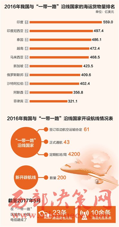 據(jù)統(tǒng)計,通過73個公路和水路口岸,中國與相關(guān)國家開通了356條國際道路客貨運(yùn)輸線路;海上運(yùn)輸服務(wù)已覆蓋“一帶一路”沿線所有國家;與43個沿線國家實現(xiàn)空中直航,每周約4200個航班;簡化了國際鐵路聯(lián)運(yùn)辦理手續(xù),促進(jìn)中歐間國際鐵路貨物聯(lián)運(yùn),開展國際鐵路運(yùn)郵合作。