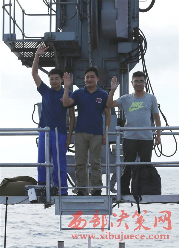 5月10日,科學(xué)家鹿博、主駕駛員齊海濱(中)和副駕駛員陳云賽(右)下潛歸來(lái)。