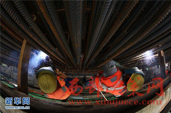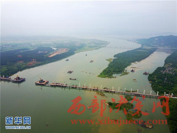 5月22日,中國鐵建二十二局的工人在蒙華鐵路贛江特大橋施工。